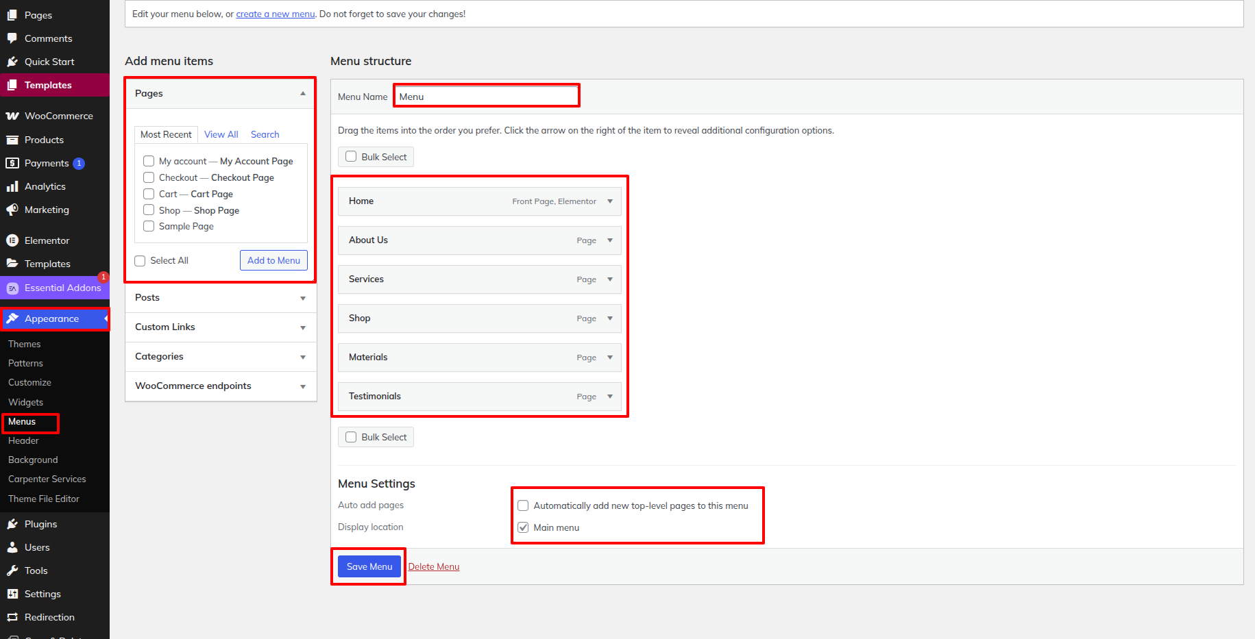 1.Pages should be added by selecting the appropriate checkboxes. After adding them, you can rearrange the menu list by dragging and dropping items into place.