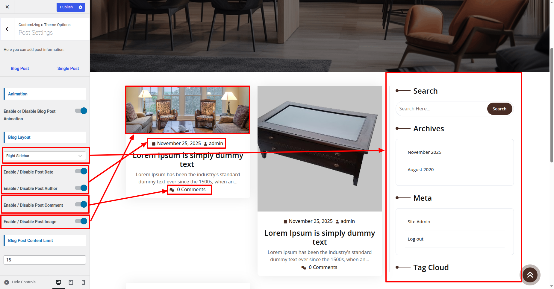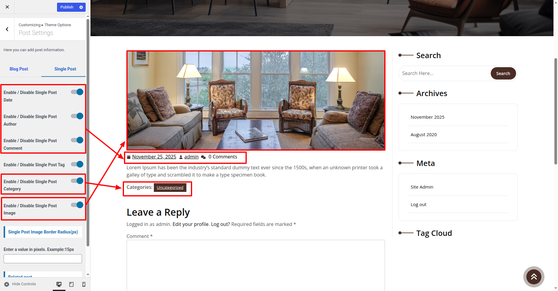 Proceed to Dashboard Customizer Theme Options Post Settings