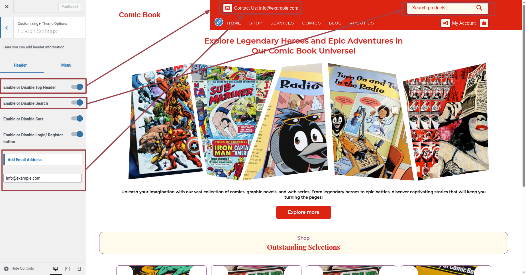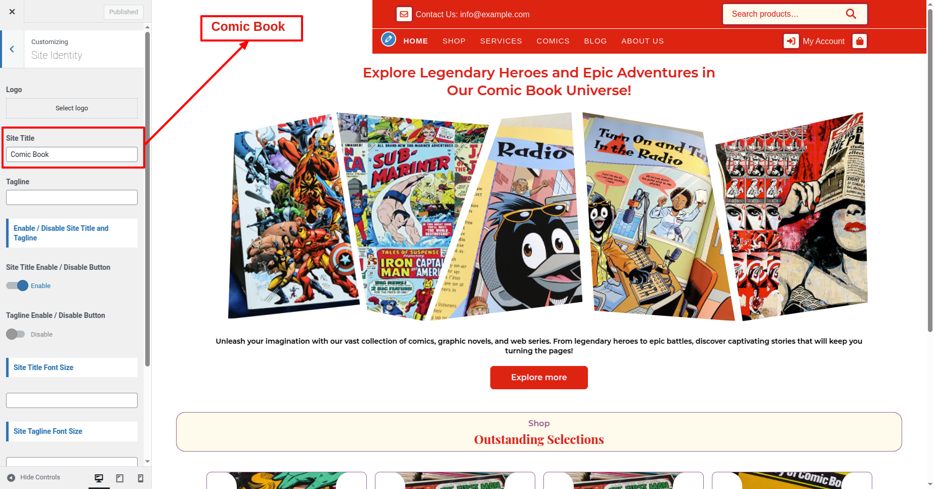 here you add site title and tagline and also add enable/disable site title and tagline button.