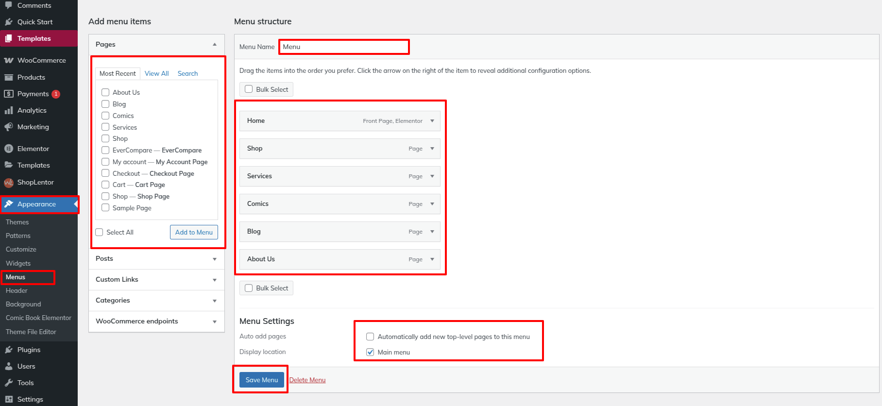 1.Pages should be added by selecting the appropriate checkboxes. After adding them, you can rearrange the menu list by dragging and dropping items into place.