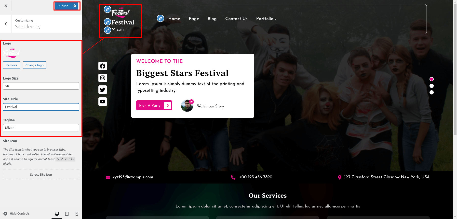 Adding the title and tagline of the site and enabling/disabling the title and tagline are possible here.
