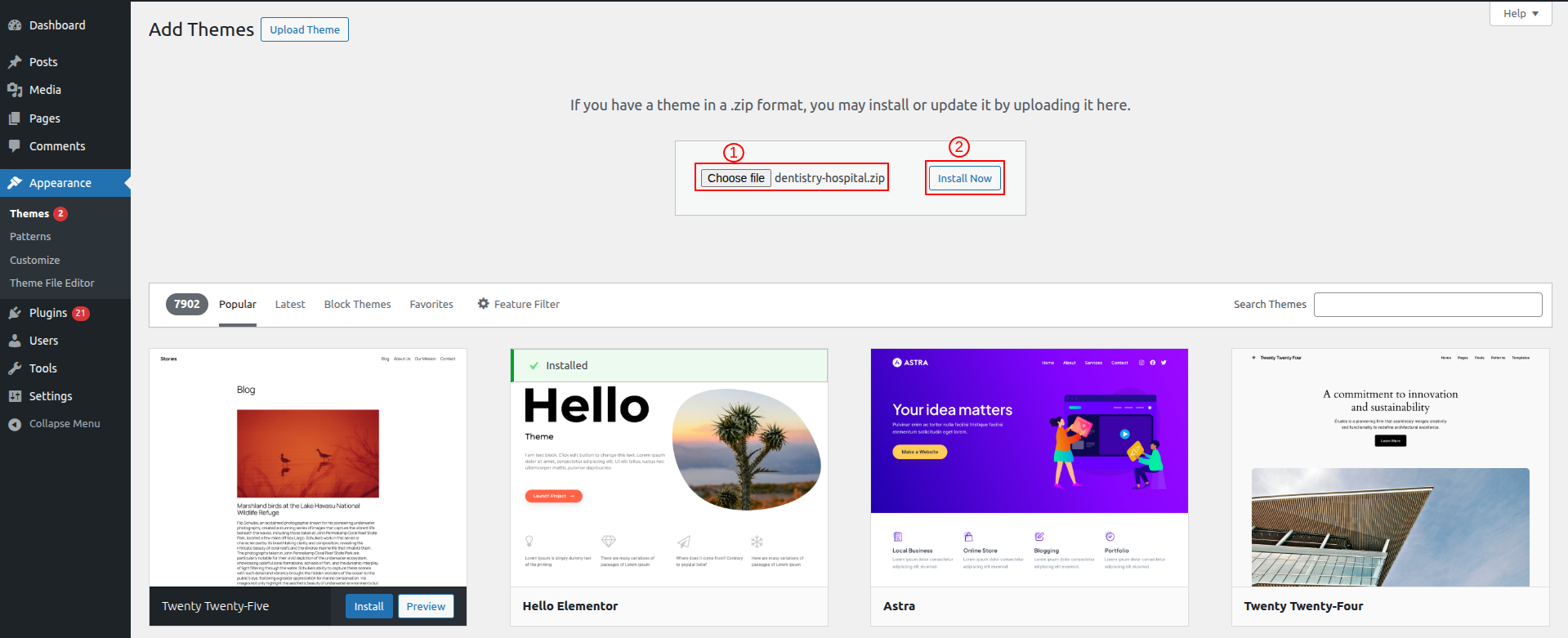 1-Use WordPress admin to install a theme.