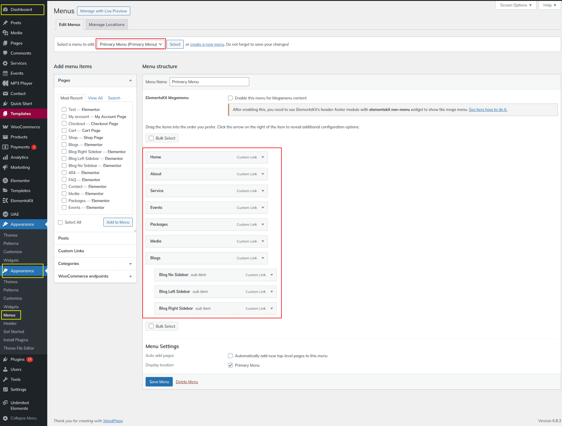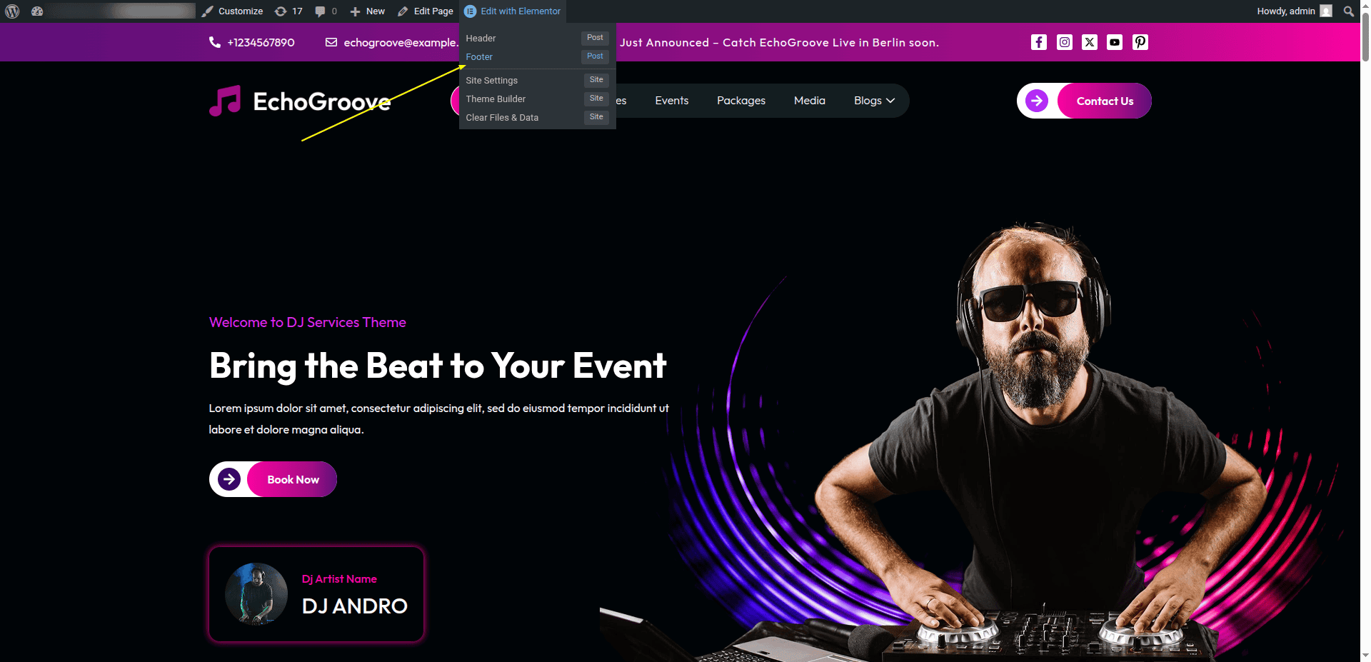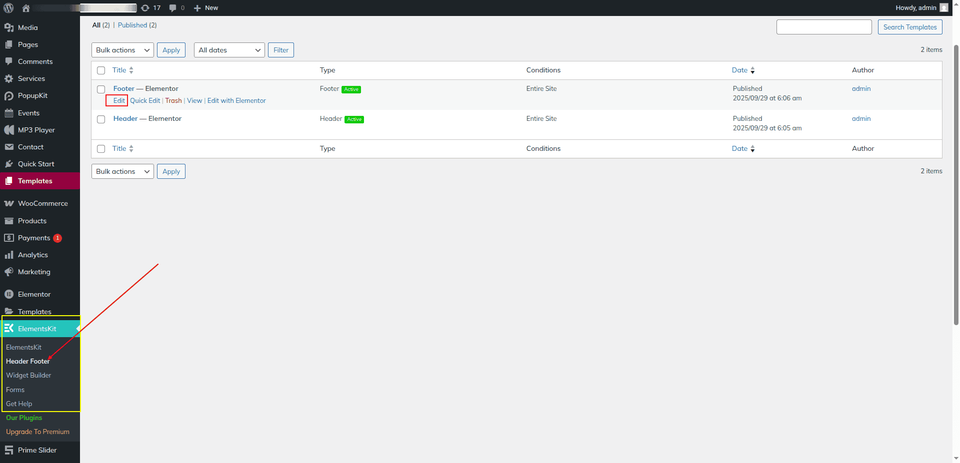 1) Go to:- Dashboard >> Elementskit >> Header Footer >> Edit.