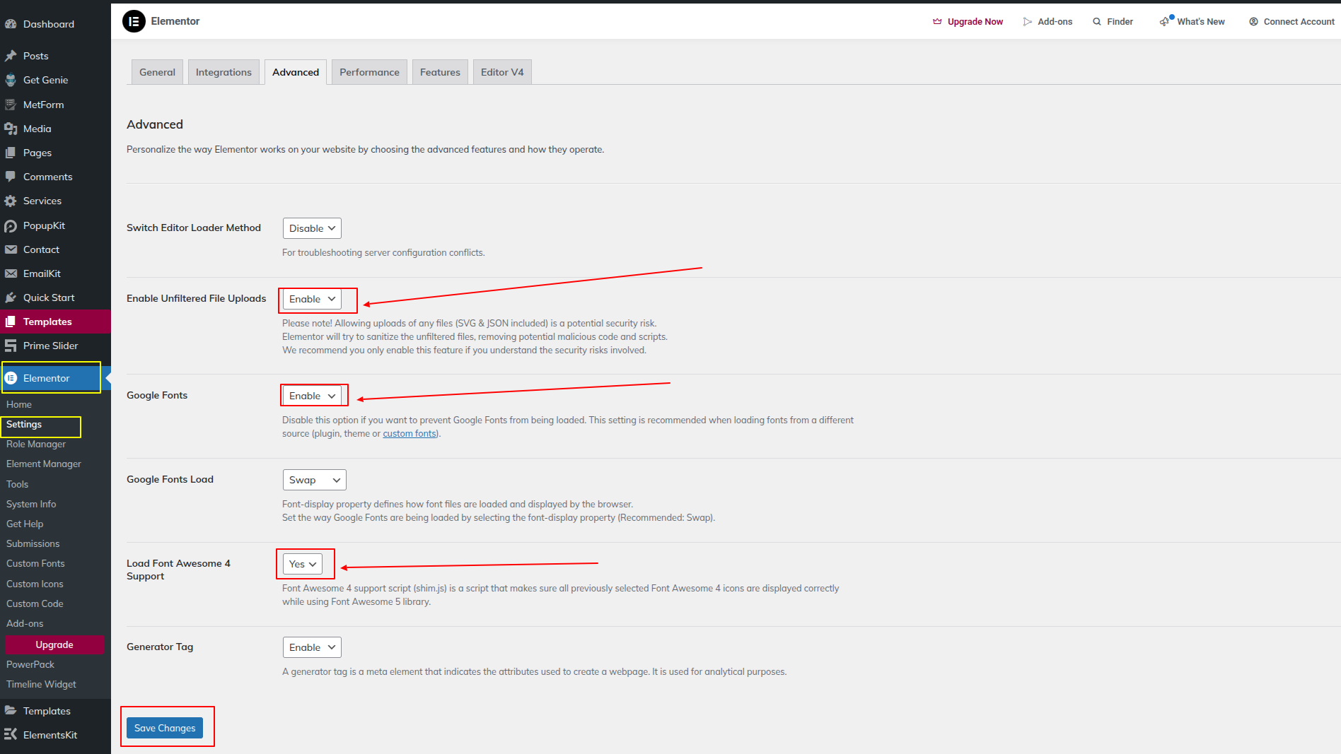After that, Click on Elementor Settings Advance, then enable or yes showing settings.