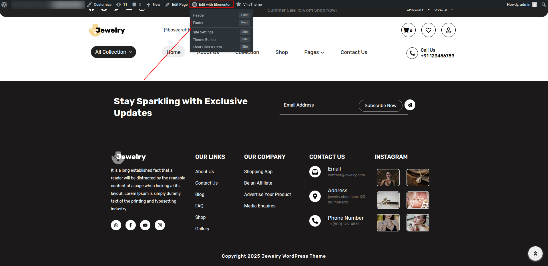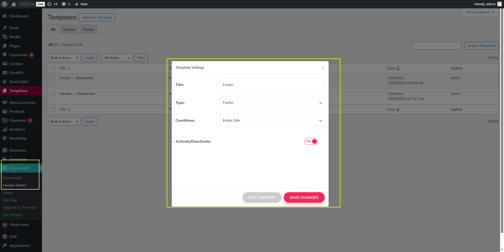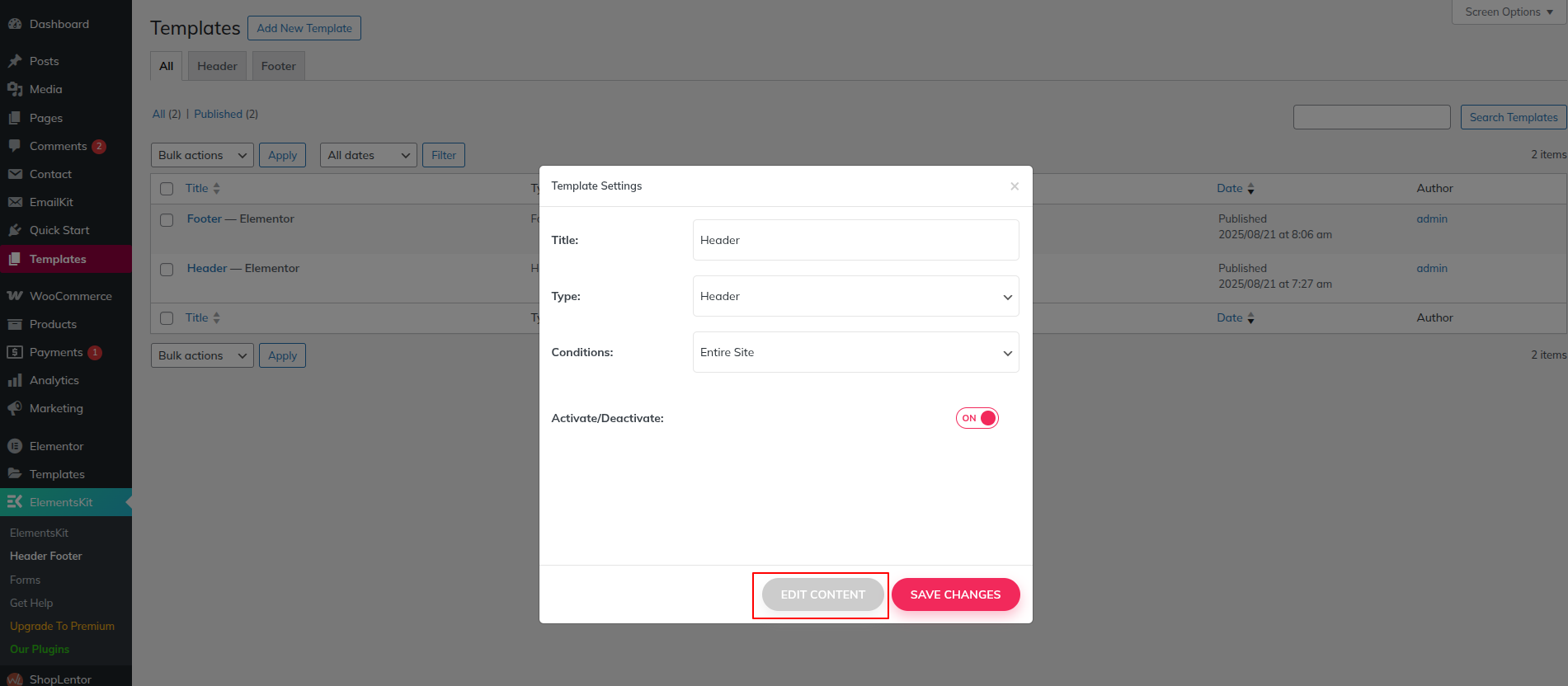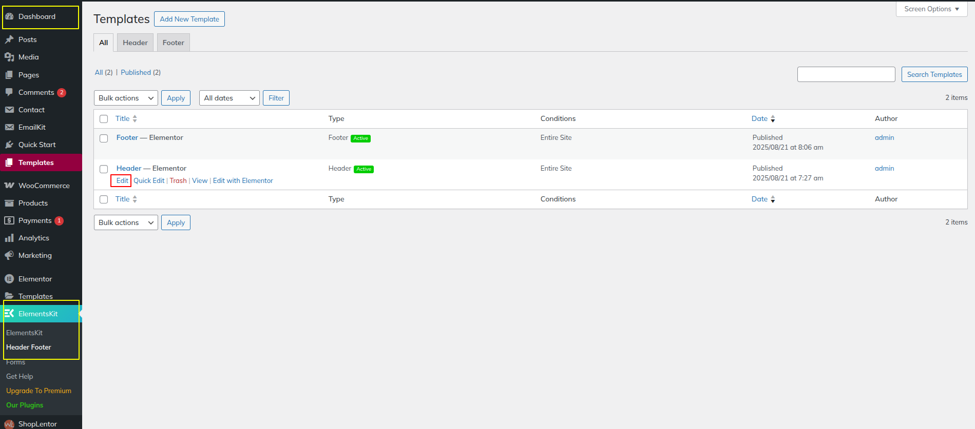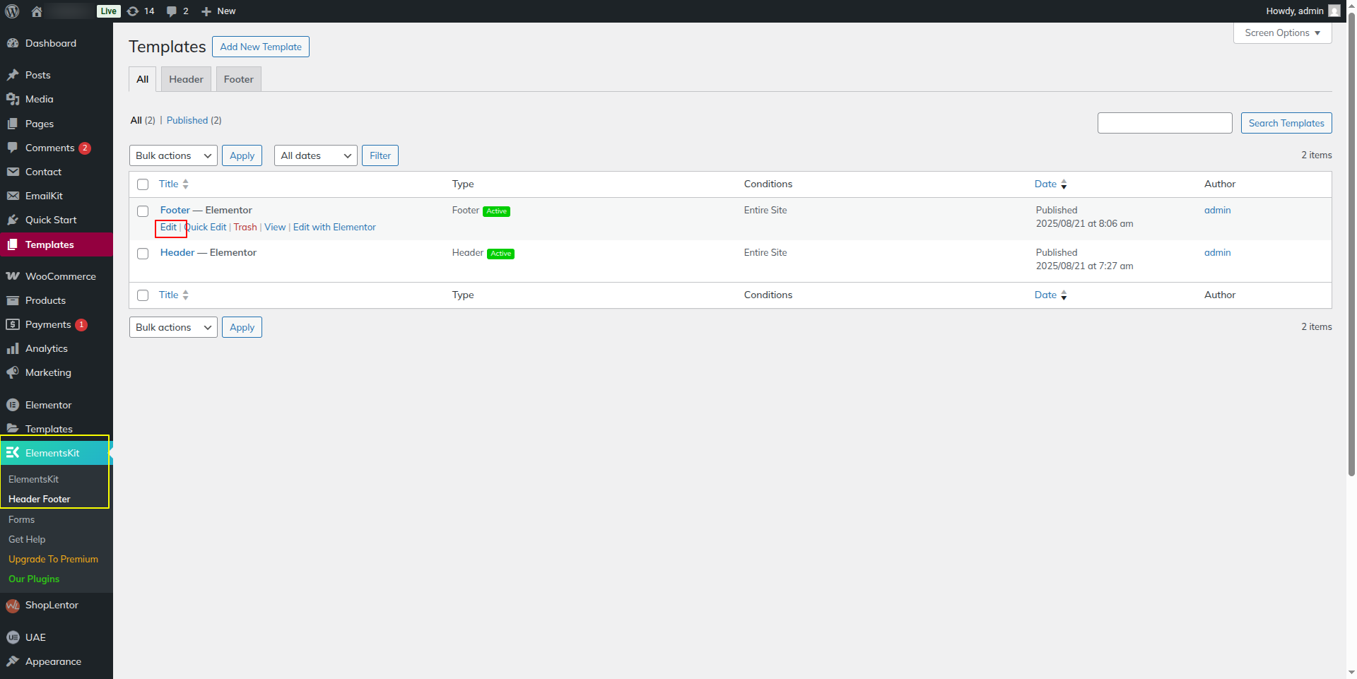 1) Go to:- Dashboard >> Elementskit >> Header Footer >> Edit.