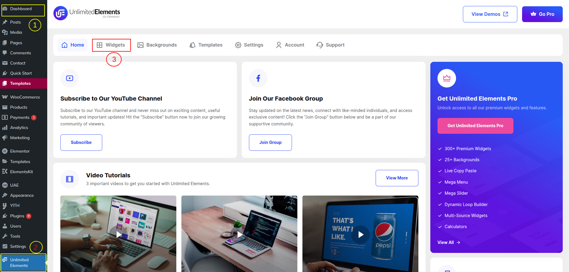1) Go to:- Dashboard >> Unlimited Elements >> Widgets.