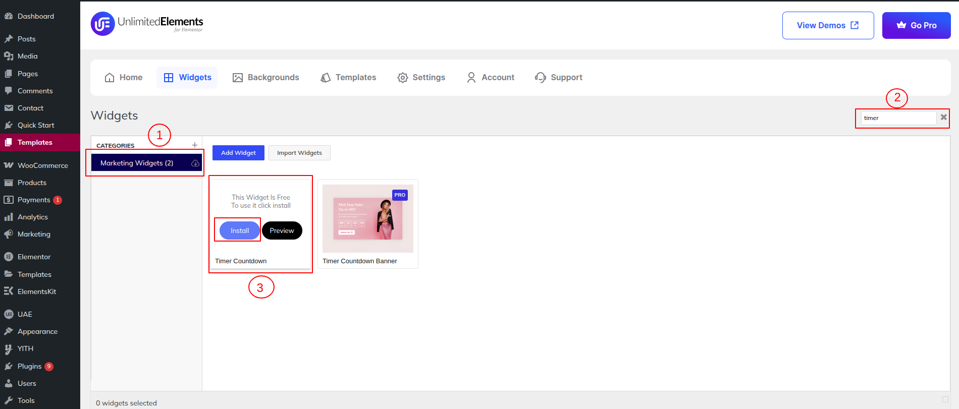After that, install the Menu Widgets by clicking on Timer Countdown.