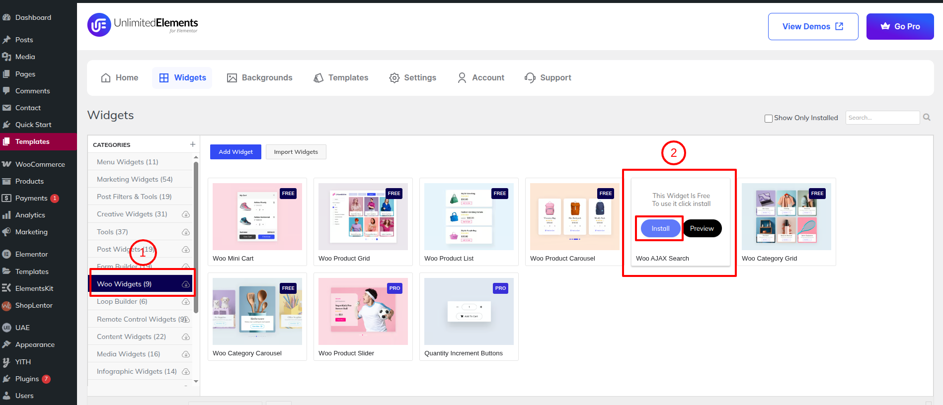 After that, install the Menu Widgets by clicking on Woo Ajax Search.