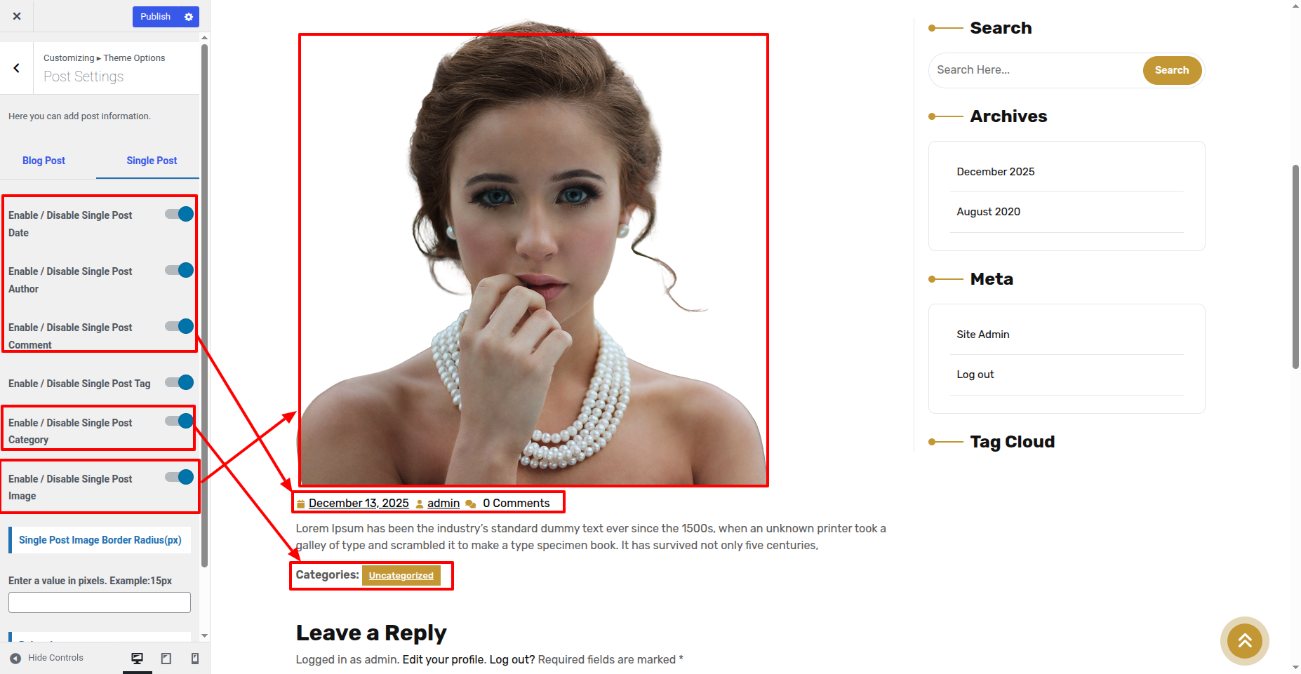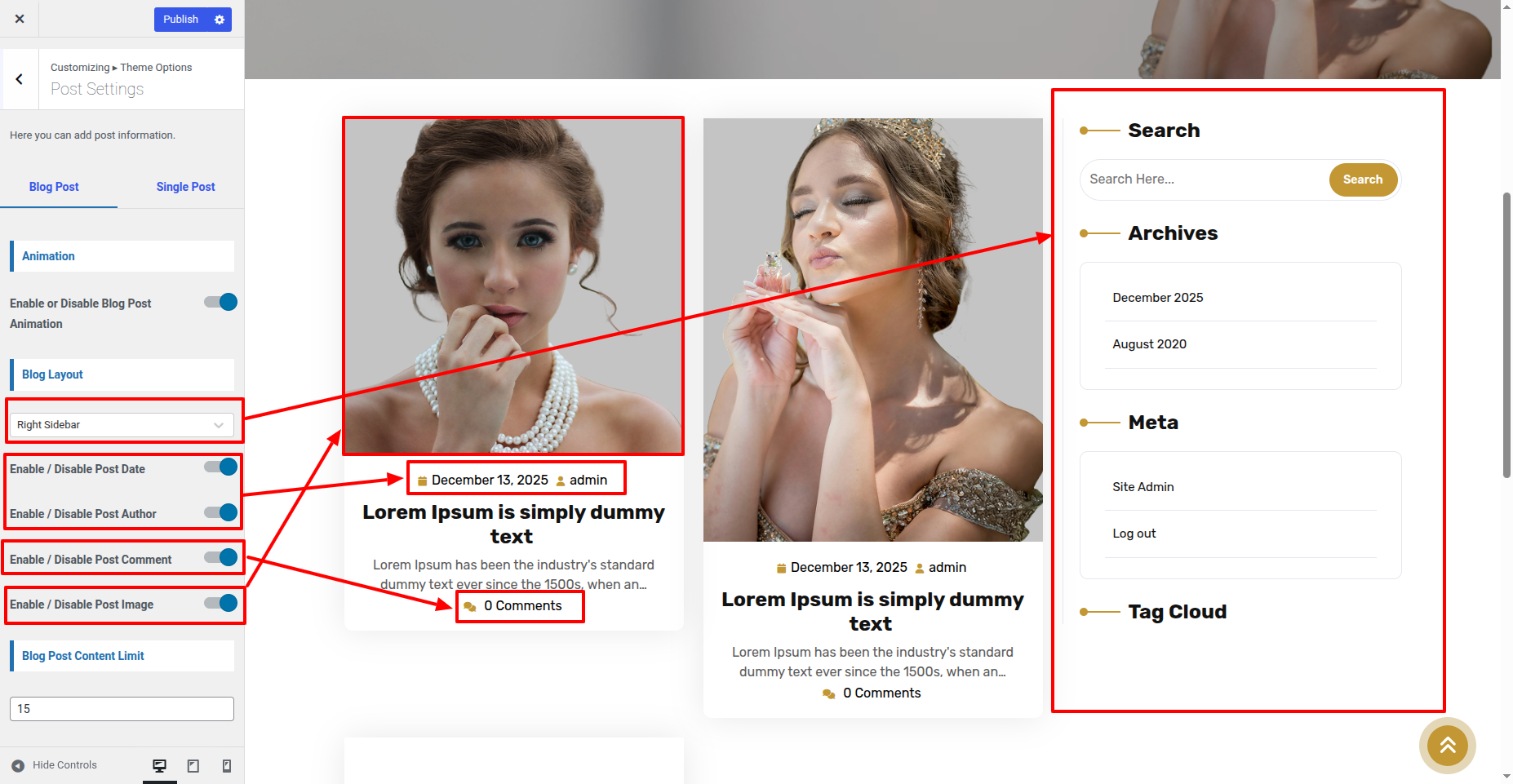 Proceed to Dashboard Customizer Theme Options Post Settings
