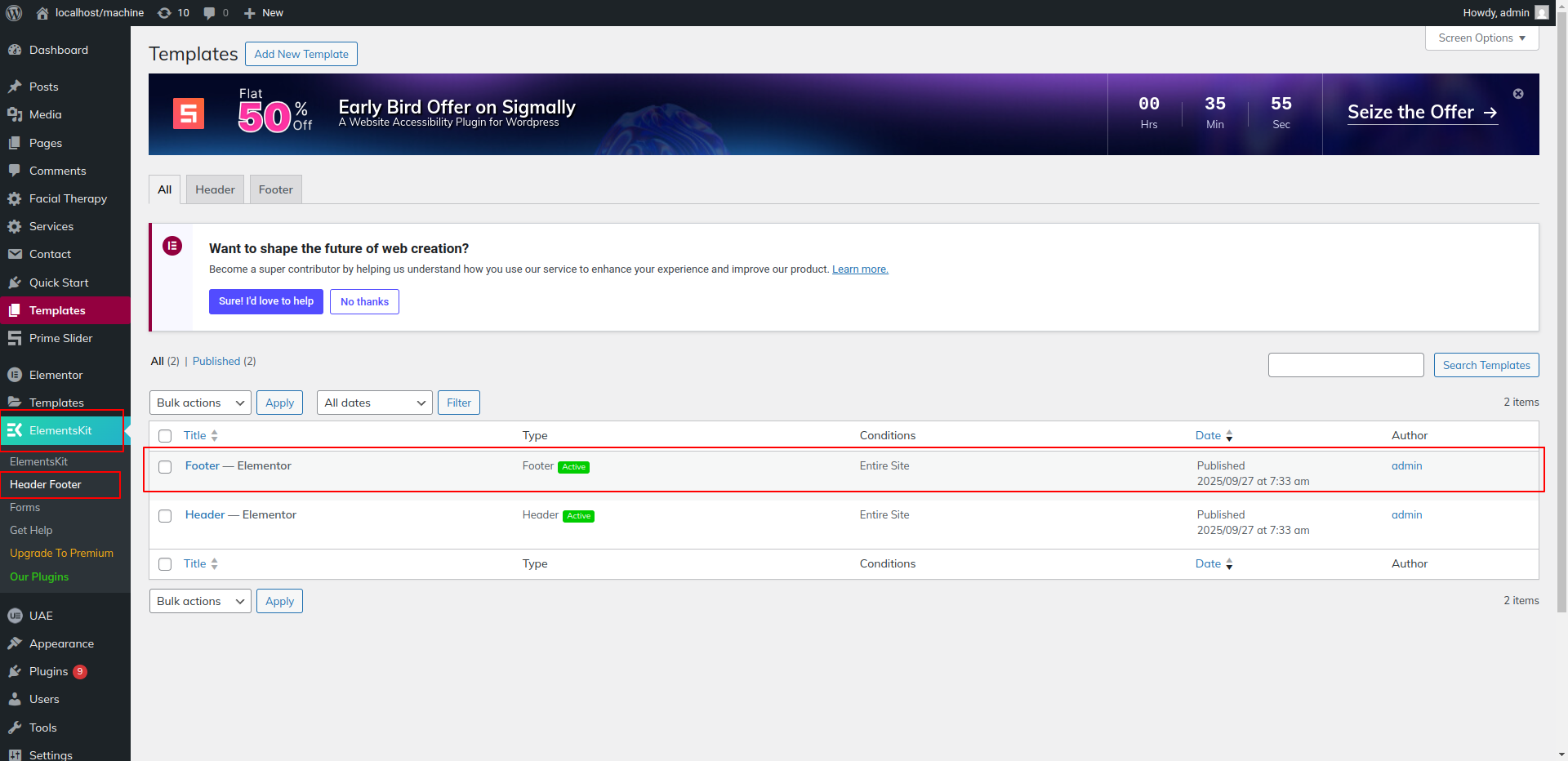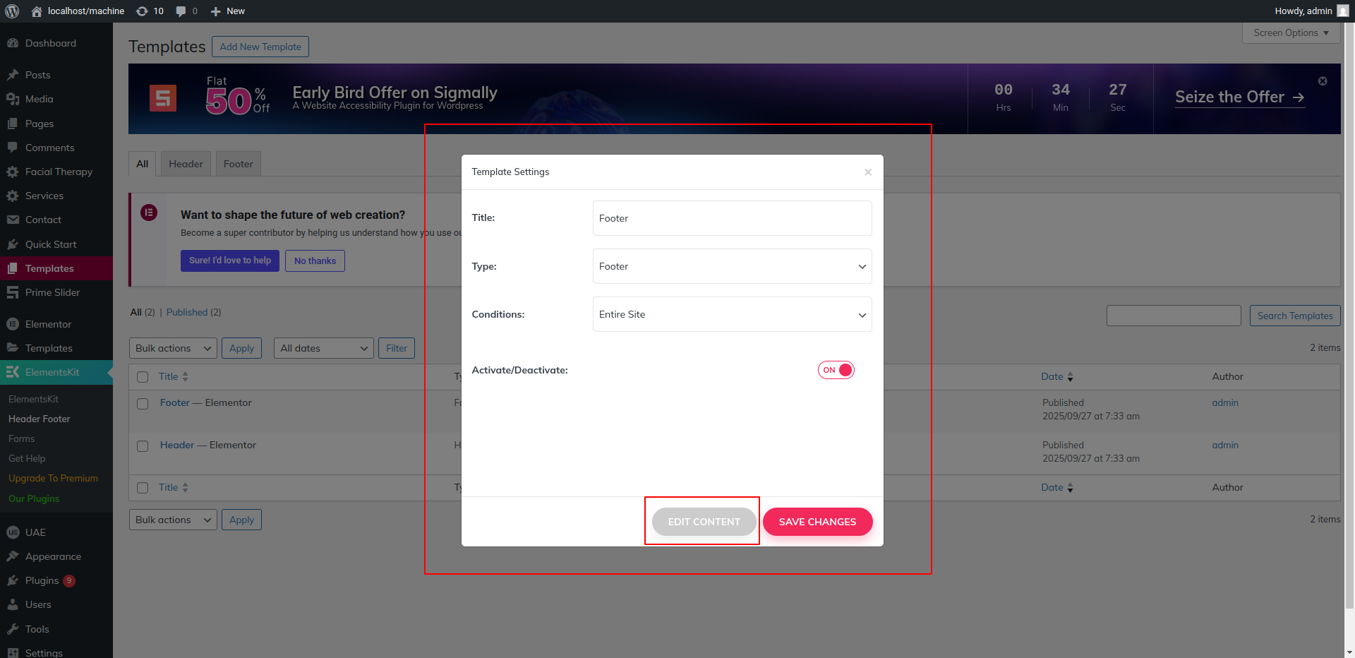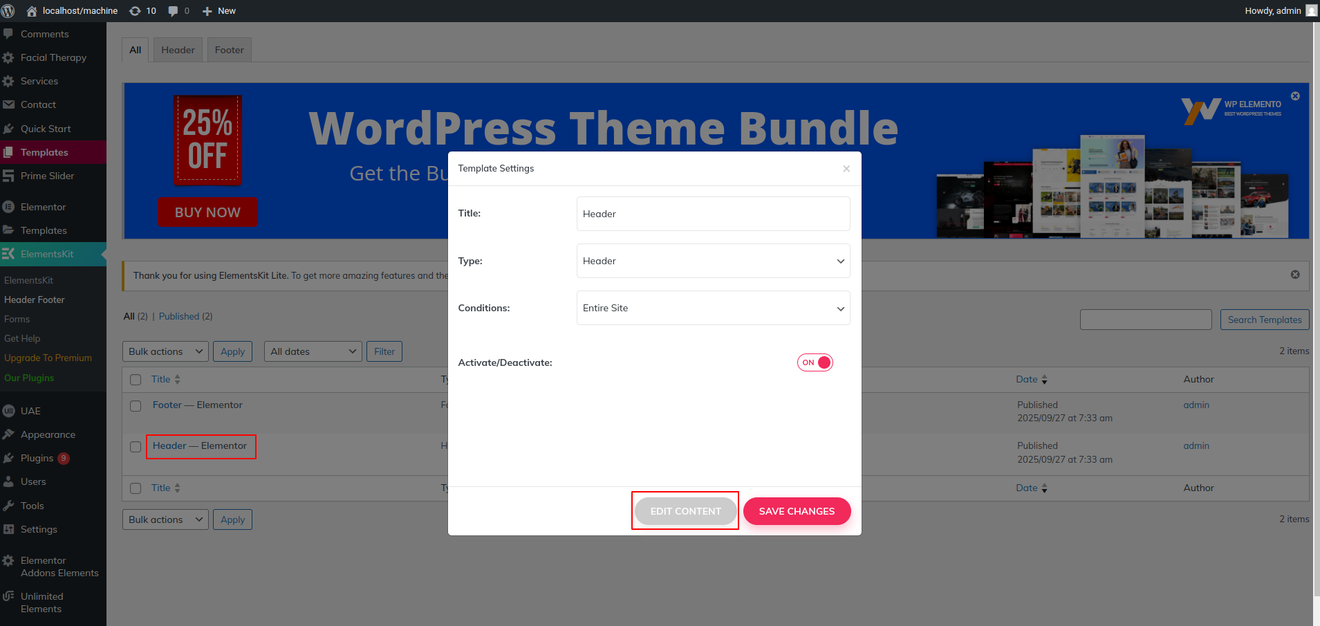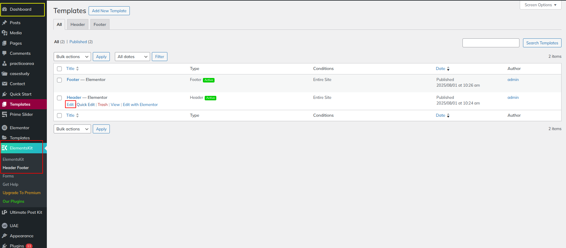 1) Go to:- Dashboard >> Elementskit >> Header Footer >> Edit.