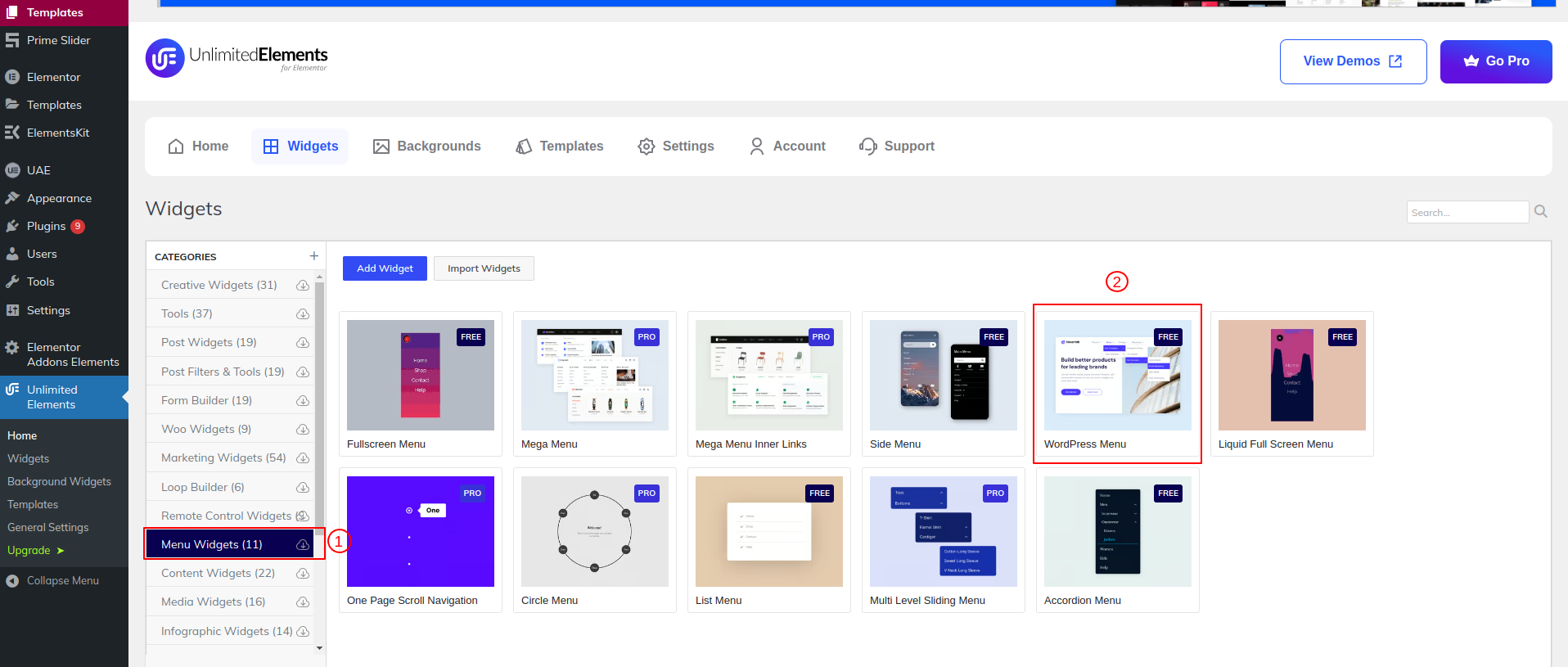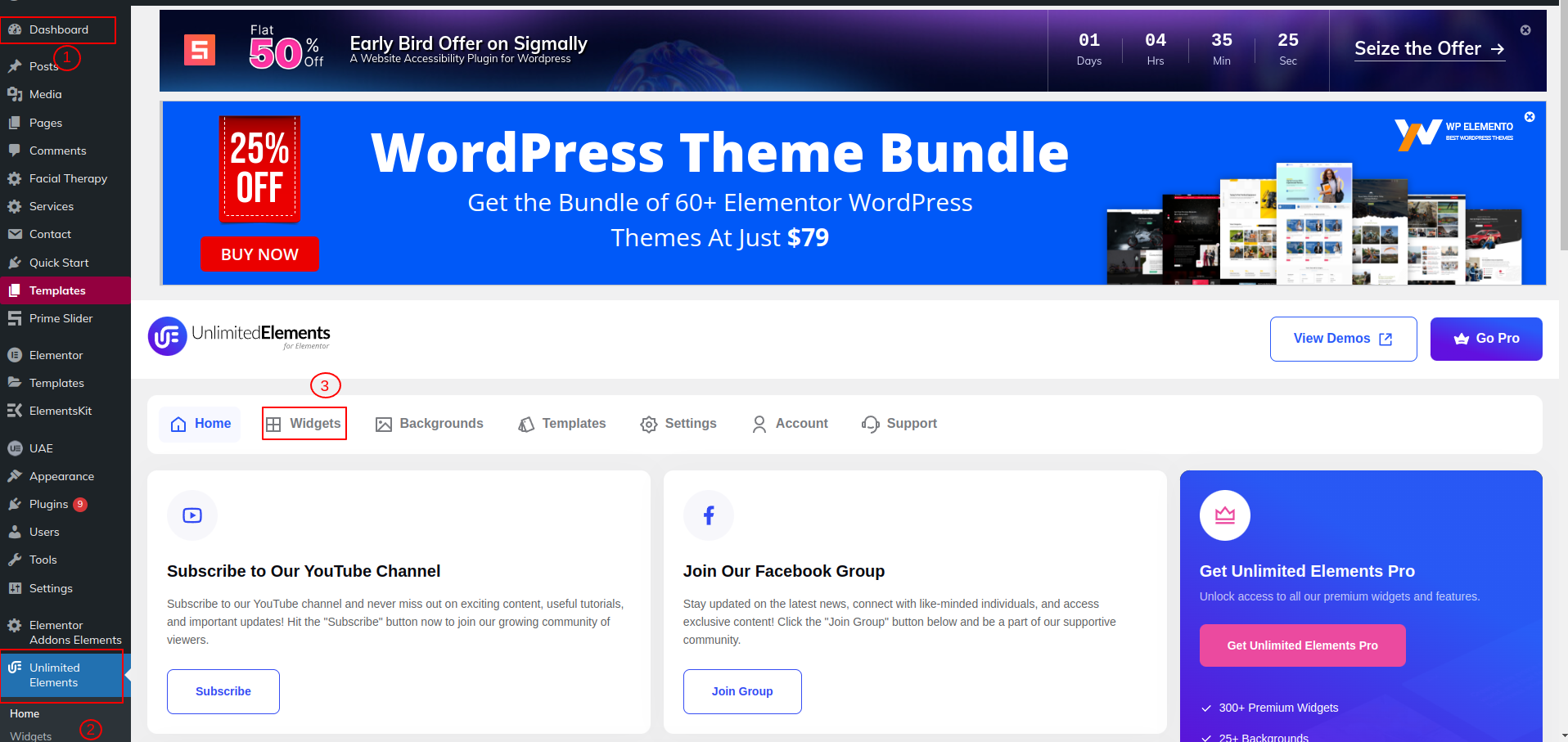 1) Go to:- Dashboard >> Unlimited Elements >> Widgets.