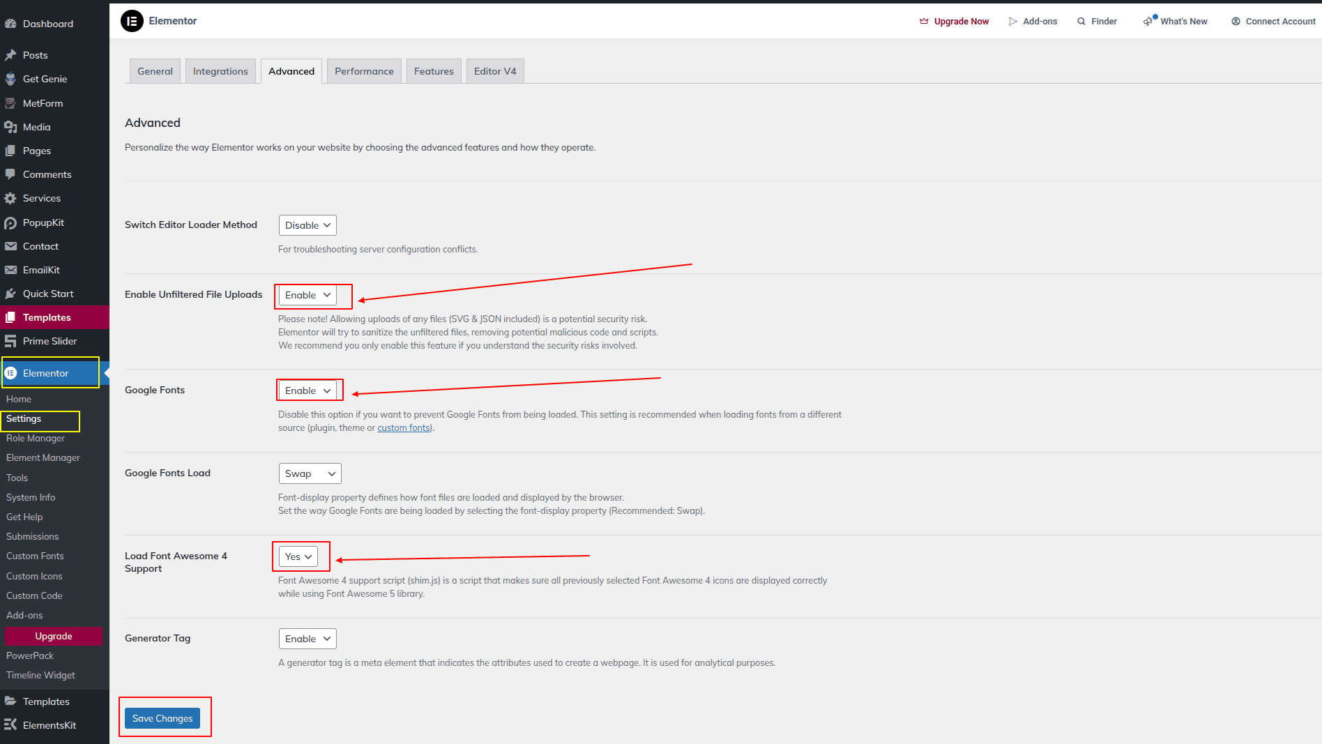 After that, Click on Elementor Settings Advance, then enable or yes showing settings.