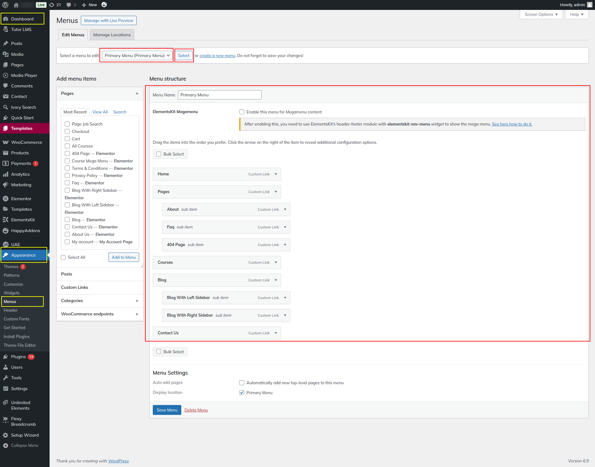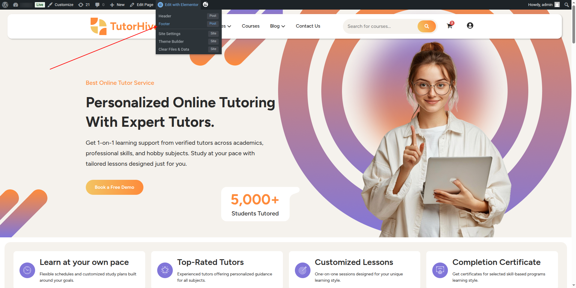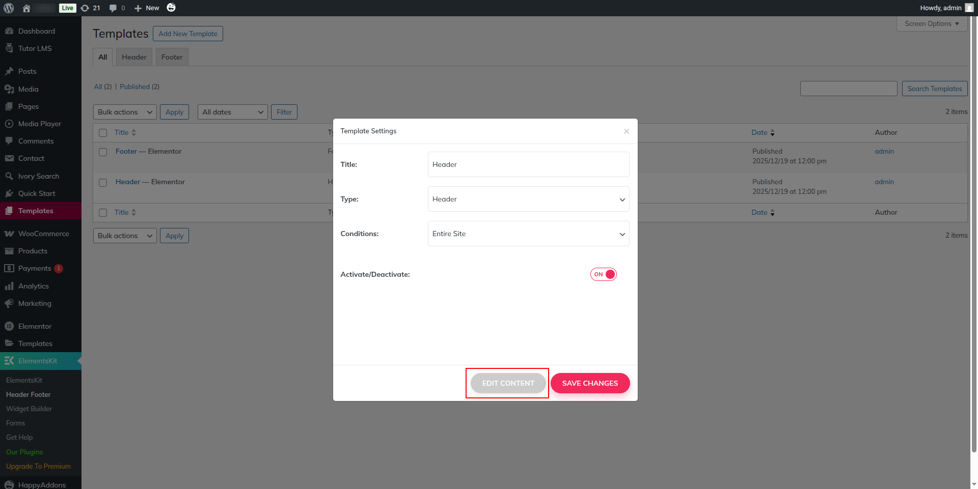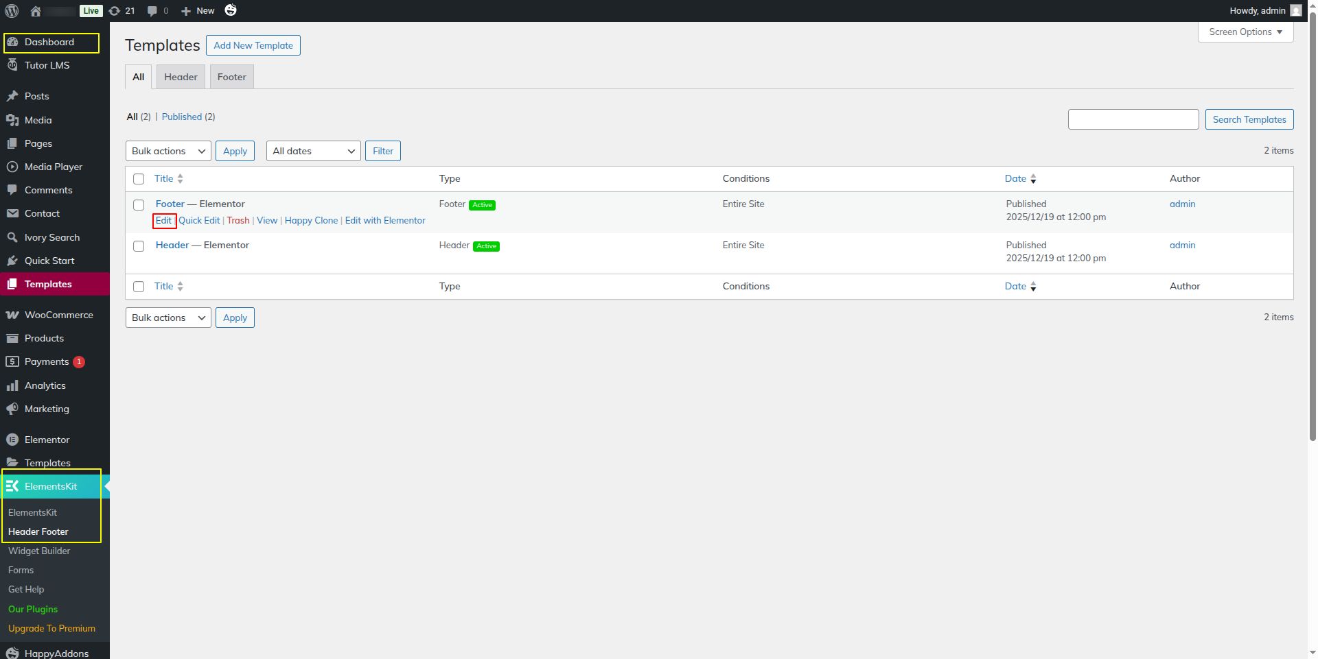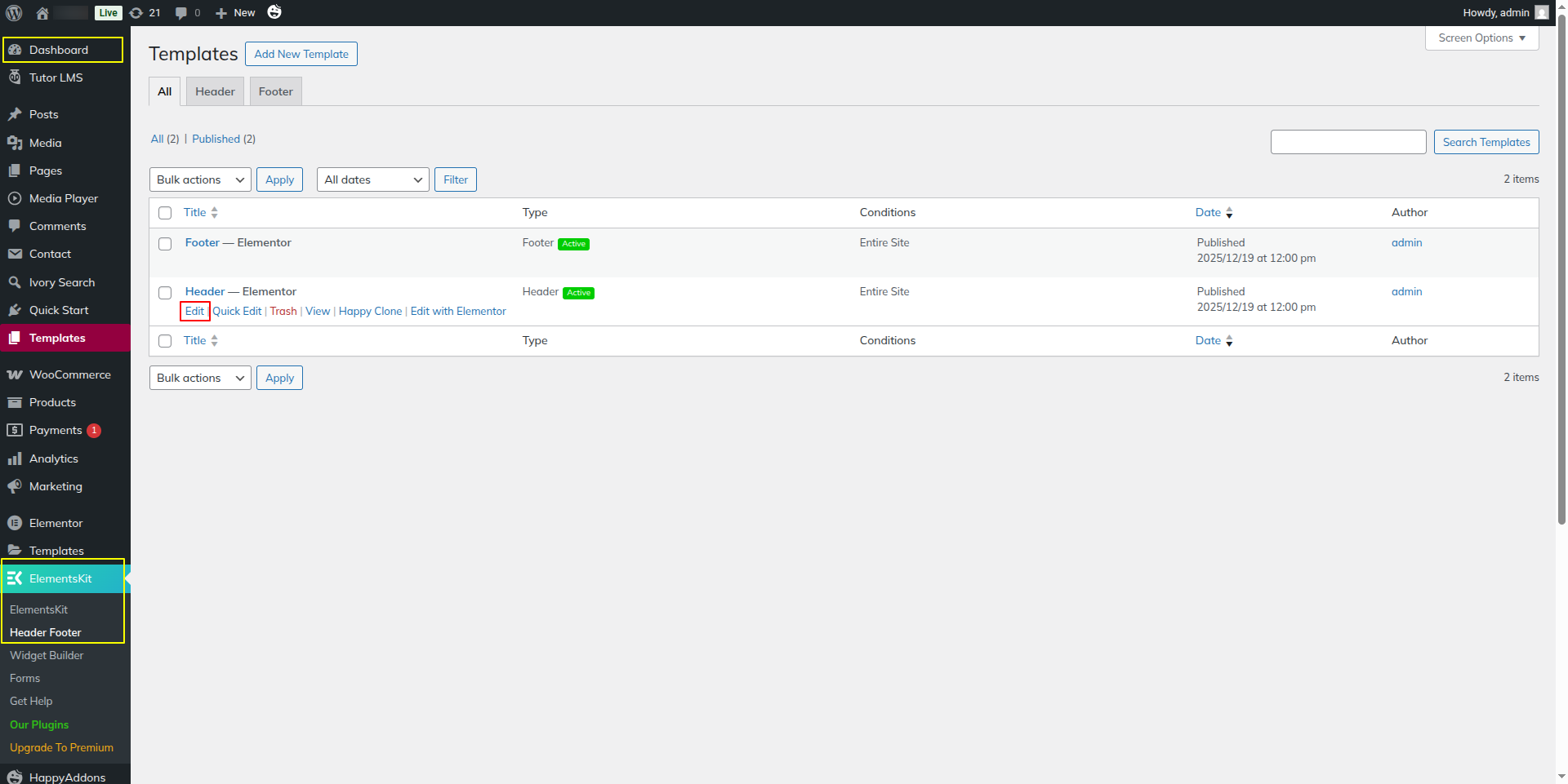 1) Go to:- Dashboard >> Elementskit >> Header Footer >> Edit.
