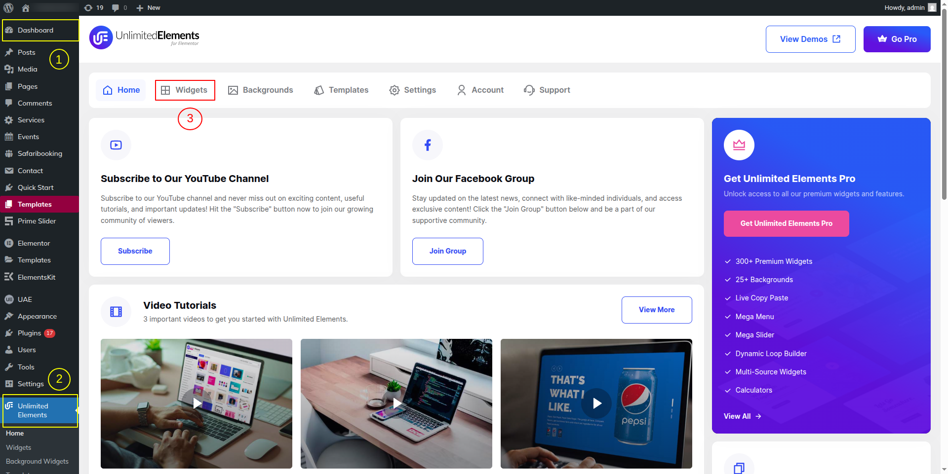 1) Go to:- Dashboard >> Unlimited Elements >> Widgets.