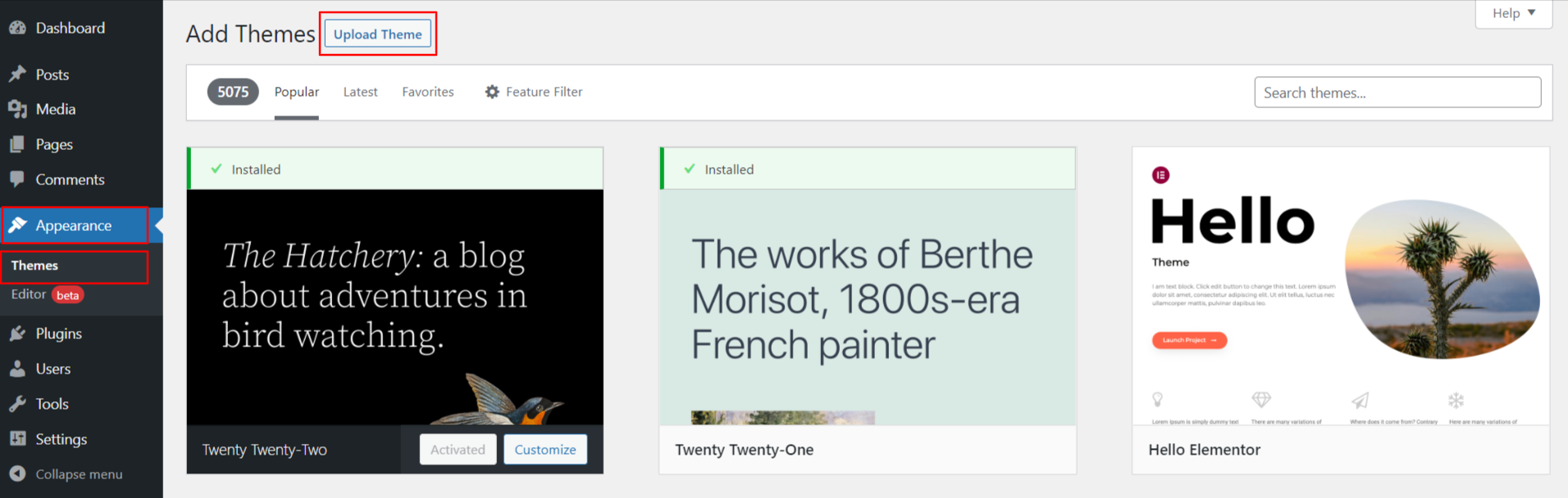 3. Click the upload button to upload the theme..