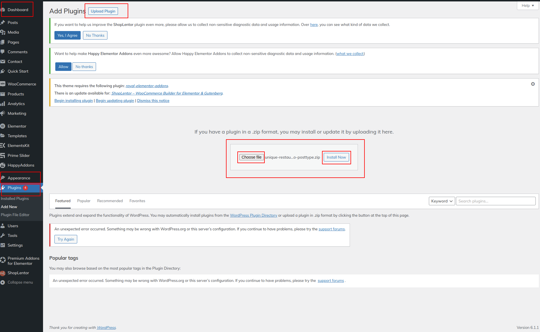 4. Click Install now after choosing your unique-restaurant-pro zip file using the Browse button..