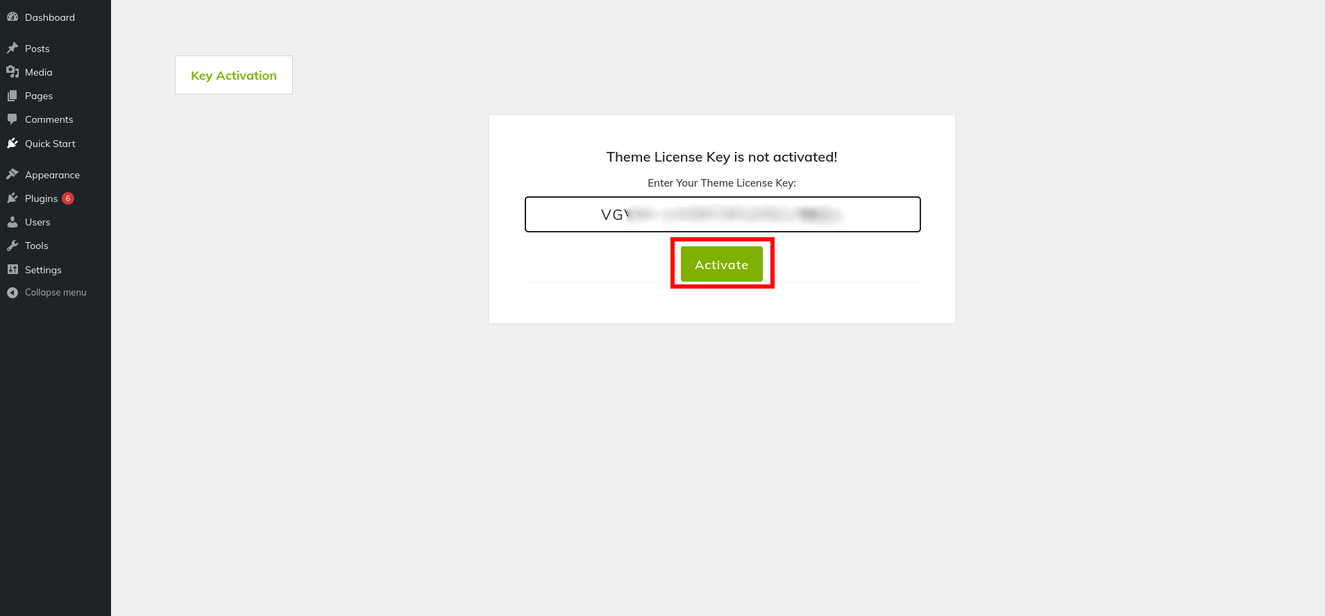 Activate by logging into your WordPress site and going to Appearance >> Themes..